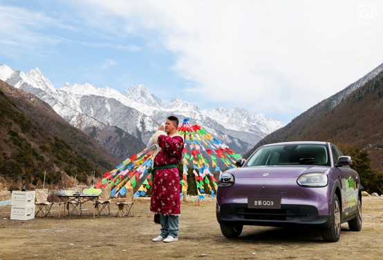 在海拔5130米的东达山垭口,经幡铺天盖地。车队停靠时,风吹动经幡的声音与车内Carmind大模型播放的藏地音乐意外地合拍。下车拍照,镜头里,全新QQ3安静地停在经幡的阴影与阳光的交界处,车身的超曲面设计倒映着五彩的经幡,像一场现代设计与古老仪式的无声对话。那一刻,车不再是闯入者,而成了风景的一部分。